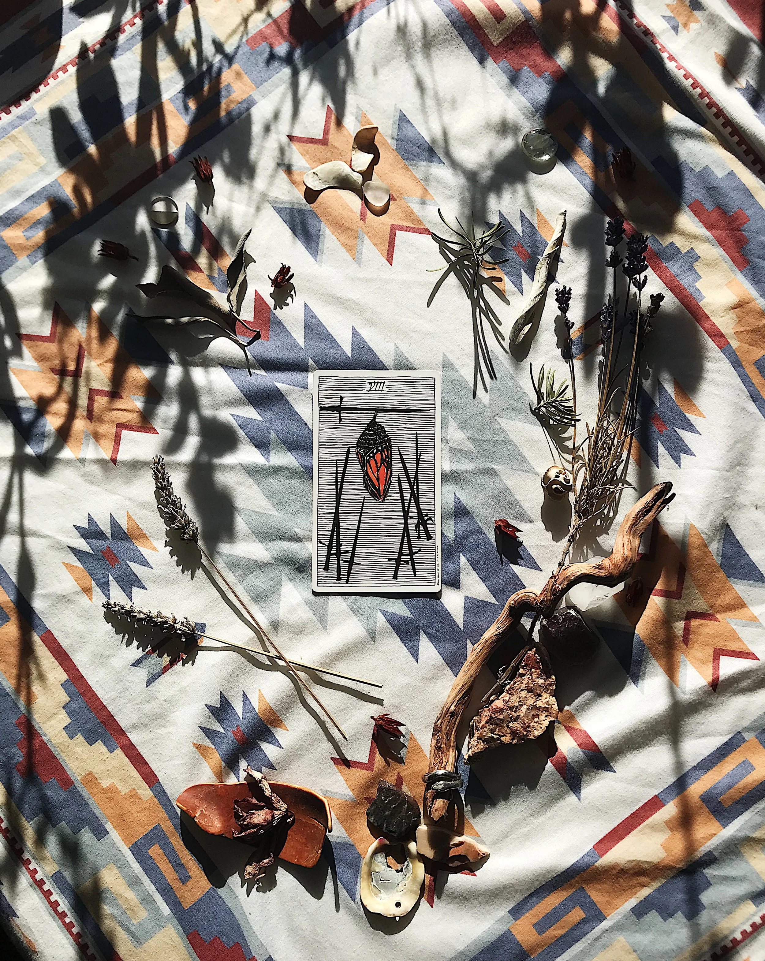 The Seven of Swords propels us into witnessing when our avoidance doesn’t work. The butterfly, with its wings wrapped around it, is unwilling to engage its environment out of fear. More than that, it is unable to look at the possibilities of what it can do to escape because it is afraid of falling, hurting, essentially making a mistake. When we are too fearful to look at ourselves, we miss out on seeing all the growth we’ve actually gone through. We don’t give ourselves a chance to break open yet another mold, a layer that could very easily be thrown off if we simply give ourselves the credit.