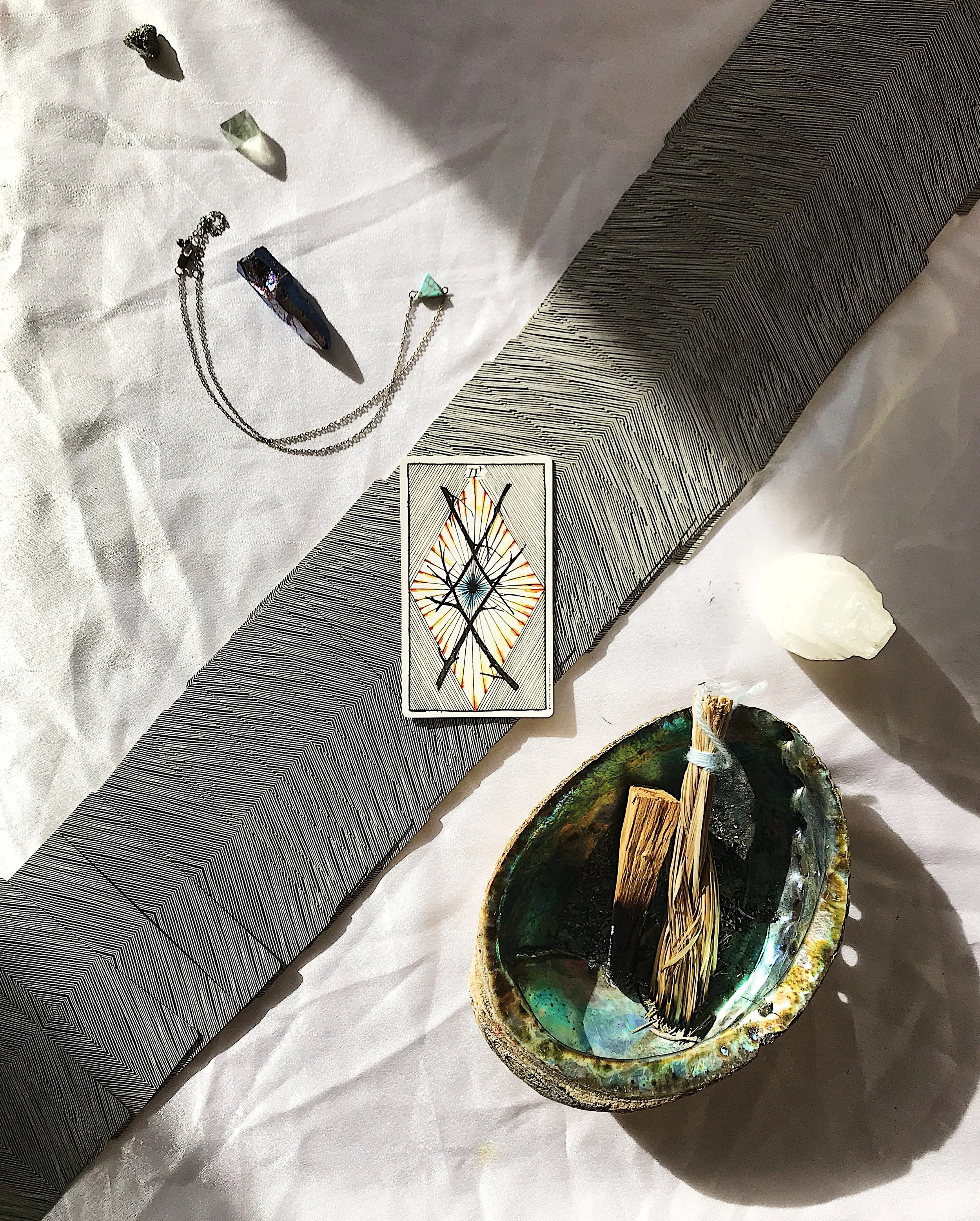 The Four of Wands is a window of opportunity to make our preparatory work worthwhile. It reminds us that we are but beginners in the season of Saturn in Capricorn. It opens our eyes to the possibilities that passion offers and inspires us to take action towards our aspirations. At the same time, the Four instructs us to test the foundation sans stubborn schemes. Keep your dream as wide as possible. Put principles into your process and let plans unfold with unexpected electricity. The most important element is not the end, but the education in designing homes for our hearts that can shift and thrive with the anomalies of nature.