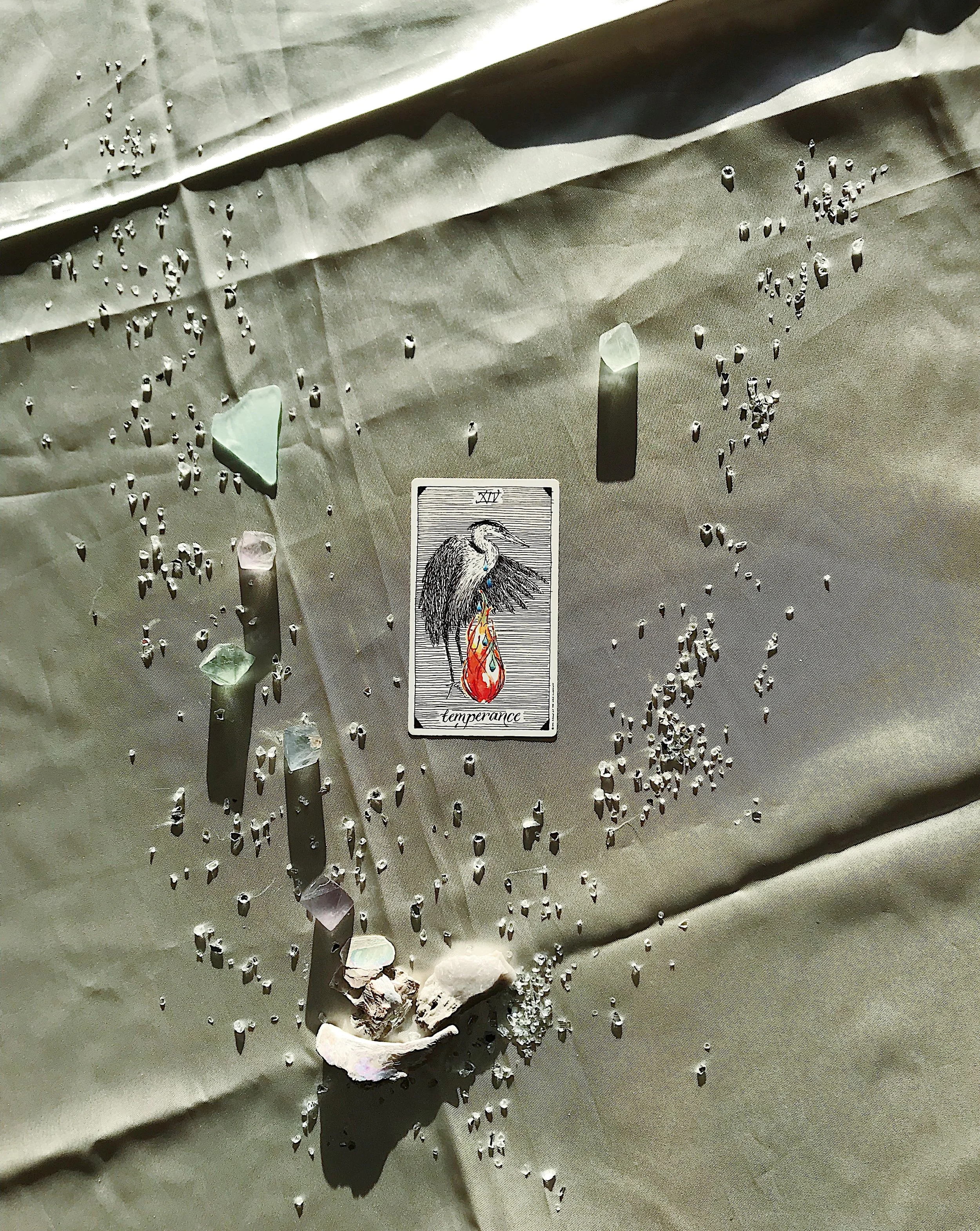 Temperance is telling of a soul that knows itself well. Is a reflection of right-sized thought followed closely by intentional action. Is evidence of understanding oneself so thoroughly that your physical flow aligns, seemingly, without effort to to support your spirit. Arriving at the end of an acutely individual journey in the major arcana, Temperance shows us the magic that happens as a result of routinely taking time and space to be our own witness.
