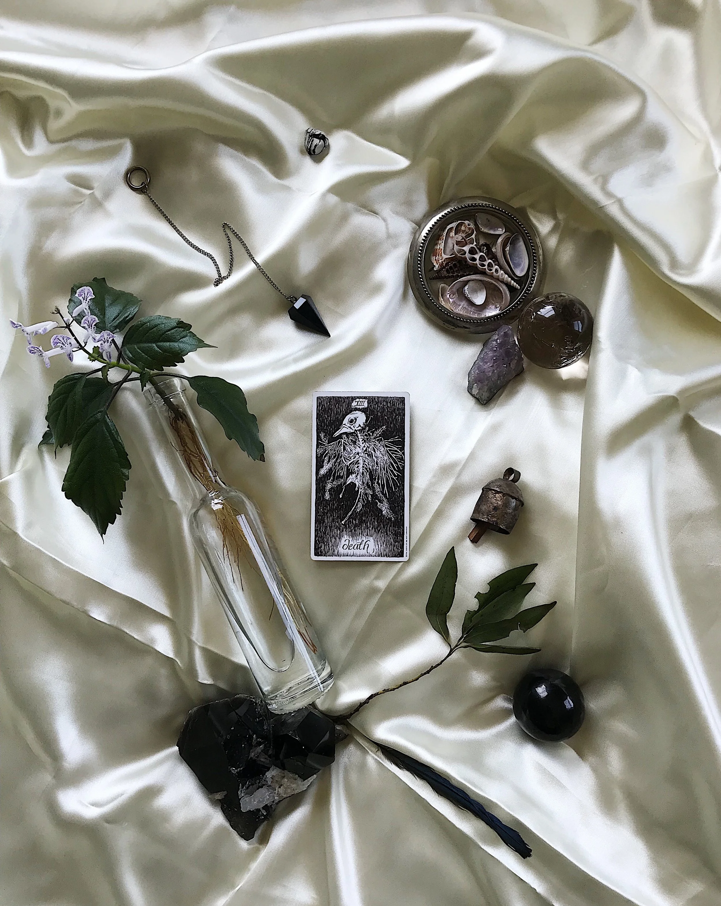 Death arrives far before the boundary line of the cycle in the major arcana. It is not the end. It is a necessary step in the turning of the wheel. It is kind. It promises relief when we unchain our ego from its shackles. And within this narrative, Death itself is also an illusion. The illusion of the end that clears the path forward but requires we have no goals while clearing it. No plans to devise or detect what is on the other side. Death, perhaps, is the moment we make the decision to no longer buy into the illusion. This decision is not forced. Death reminds us how much power we do not have. We don’t get to choose when death happens. We cannot plan our surrender, nor what it brings us. We can only prepare ourselves for the act of letting go. We can practice getting ready to receive the elements as they arrive. We practice by trying to return until the realization of death dawns on us. In that emergence, death is fleeting, fragile and already shifting.