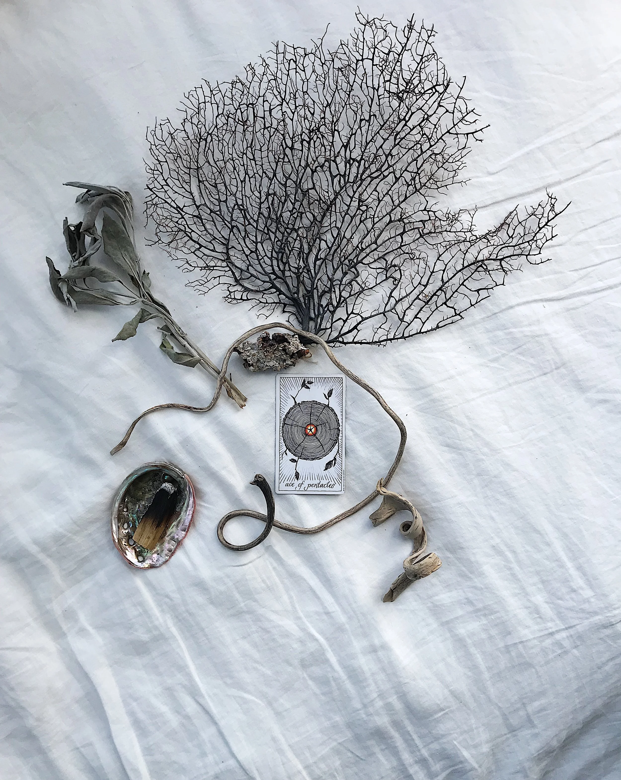 The Ace of Pentacles is like a grandmother clock that tells the whole day. It is the summation of our seconds. It speaks to first sights, second glances and thrice charmed gazes. Every moment of our lives held in the spirit of our potential. It concretizes our intention. It mentions the action that follows but has yet to come. It is the plan to manifest soul fire. It is the thread prepped on the loom and promised for weaving. It is the eyes we make and what we mean by them. It knows that meaning well means being kind to ourselves. It understands that kindness directed inwards multiplies itself outwards. It acknowledges that part of being kind means allowing ourselves to want things. To desire a future filled with good bread, clear water, lush healthy lands, warm hearths, cocooning embraces, attentive regards and generous hands. The Ace of Pentacles, in its circular form, acknowledges the function of moving as one. It grounds us in the actions that define and devise the things we want to see come to light.